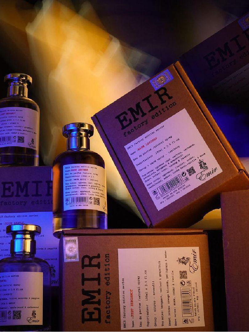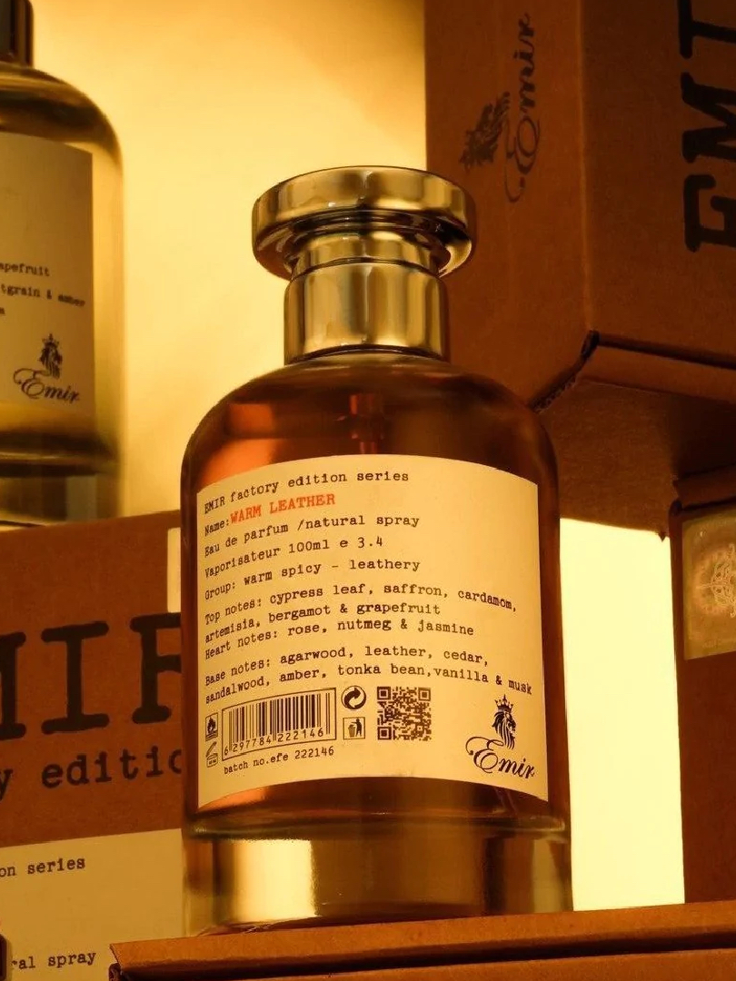 WARM LEATHER Emir je amber drveni miris za žene i muškarce, izuzetno bogat drveno-cvetni miris. Parfem se otvara bogatim spojem citrusa, bilja i začina dok meša bergamot i grejp sa šafranom, kardamonom, artemizijom i iglicama čempresa. U srcu se razvijaju cvetne note jasmina i bugarske ruže u kombinaciji sa nijansama muškatnog oraščića. Osnova ovog mirisa uvodi tople arome kože, dragocenog ouda, kedra, sandalovine, ambera, mošusa, tonke i vanile.